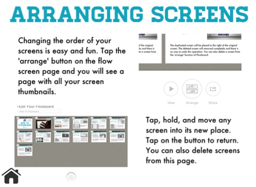 Changing the order of your screens is easy and fun. Tap the 'arrange' button on the flow screen page and you will see a page with all your screen thumbnails.