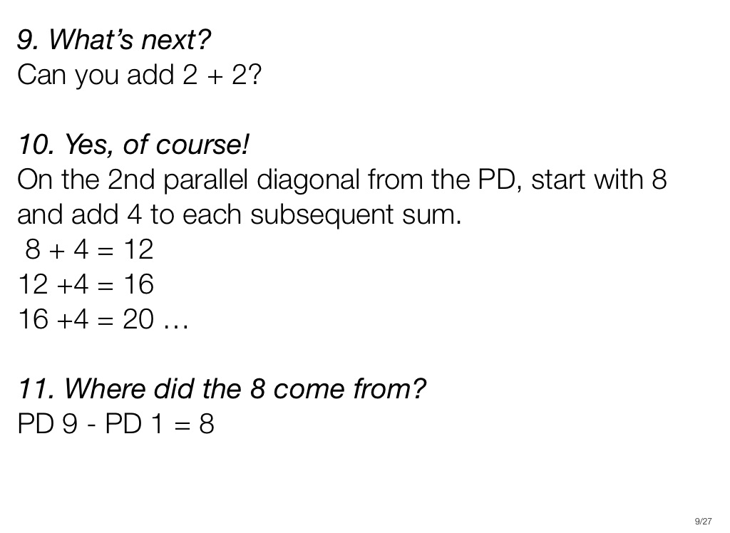 On the 2nd parallel diagonal from the PD, start with 8 and add 4 to each subsequent sum.