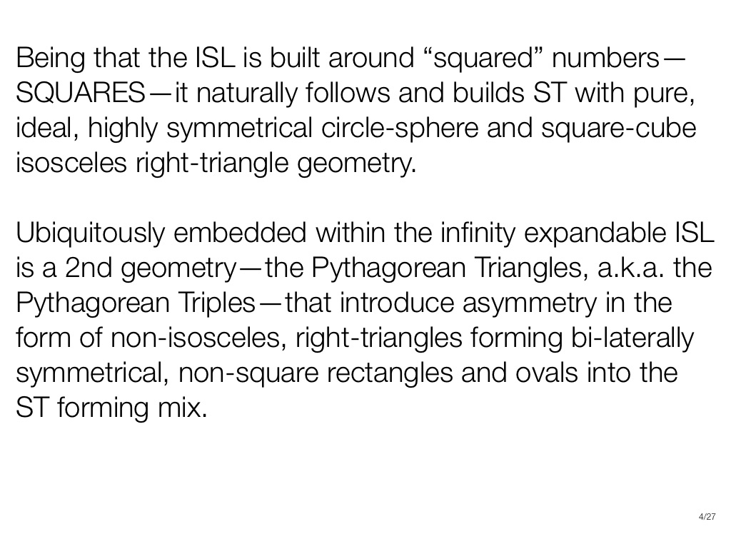 Being that the ISL is built around “squared” numbers—SQUARES—it naturally follows and builds ST with pure, ideal, highly symmetrical circle-sphere and square-cube isosceles right-triangle geometry.