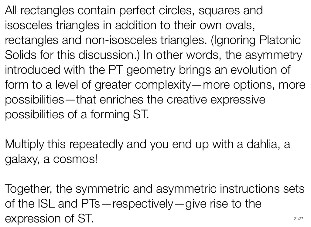 All rectangles contain perfect circles, squares and isosceles triangles in addition to their own ovals, rectangles and non-isosceles triangles. (Ignoring Platonic Solids for this discussion.) In other words, the asymmetry introduced with the PT geometry brings an evolution of form to a level of greater complexity—more options, more possibilities—that enriches the creative expressive possibilities of a forming ST.