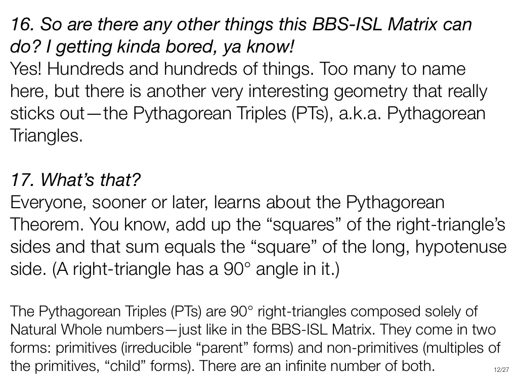 The Pythagorean Triples (PTs) are 90° right-triangles composed solely of Natural Whole numbers—just like in the BBS-ISL Matrix. They come in two forms: primitives (irreducible “parent” forms) and non-primitives (multiples of the primitives, “child” forms). There are an infinite number of both.