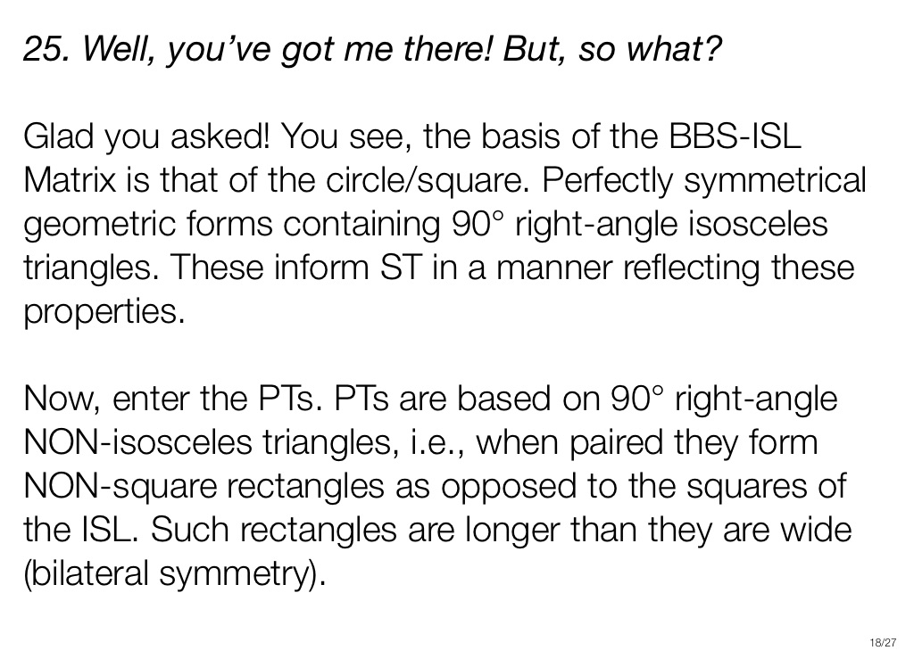 Glad you asked! You see, the basis of the BBS-ISL Matrix is that of the circle/square. Perfectly symmetrical geometric forms containing 90° right-angle isosceles triangles. These inform ST in a manner reflecting these properties.