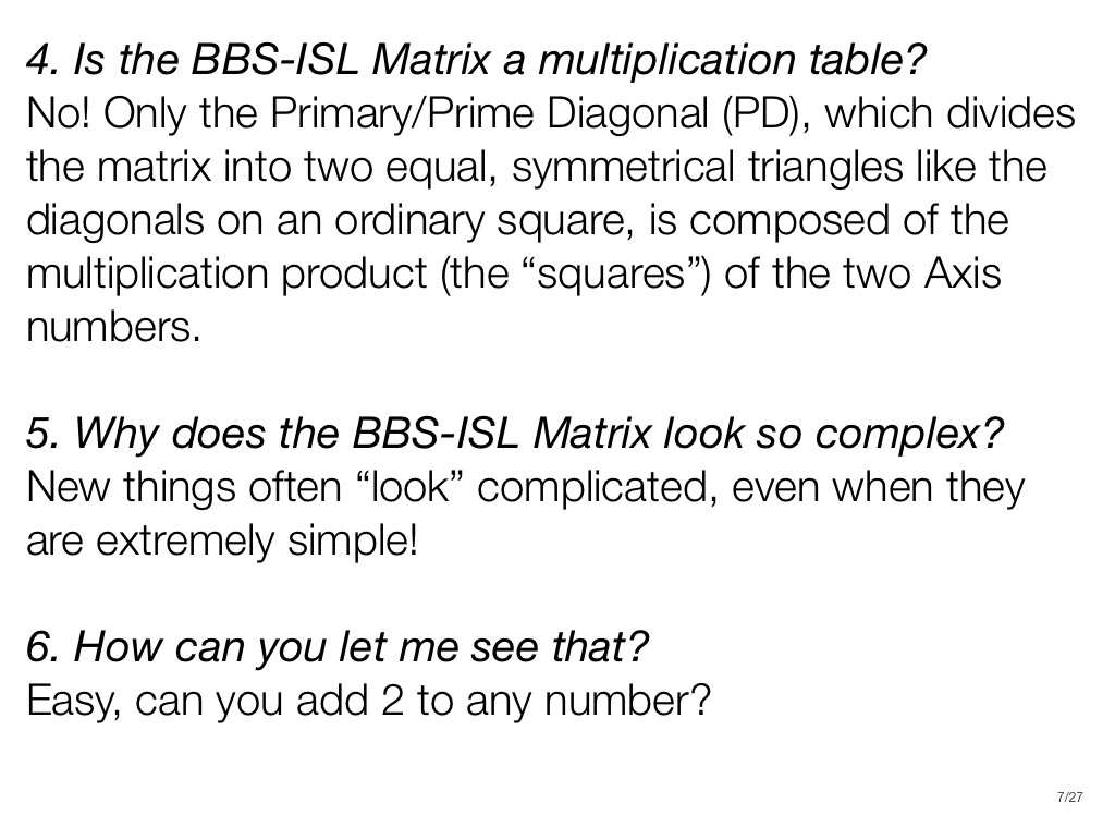 No! Only the Primary/Prime Diagonal (PD), which divides the matrix into two equal, symmetrical triangles like the diagonals on an ordinary square, is composed of the multiplication product (the “squares”) of the two Axis numbers.