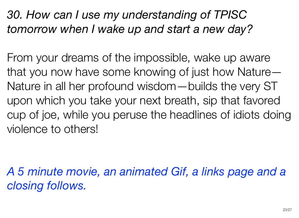 From your dreams of the impossible, wake up aware that you now have some knowing of just how Nature—Nature in all her profound wisdom—builds the very ST upon which you take your next breath, sip that favored cup of joe, while you peruse the headlines of idiots doing violence to others!