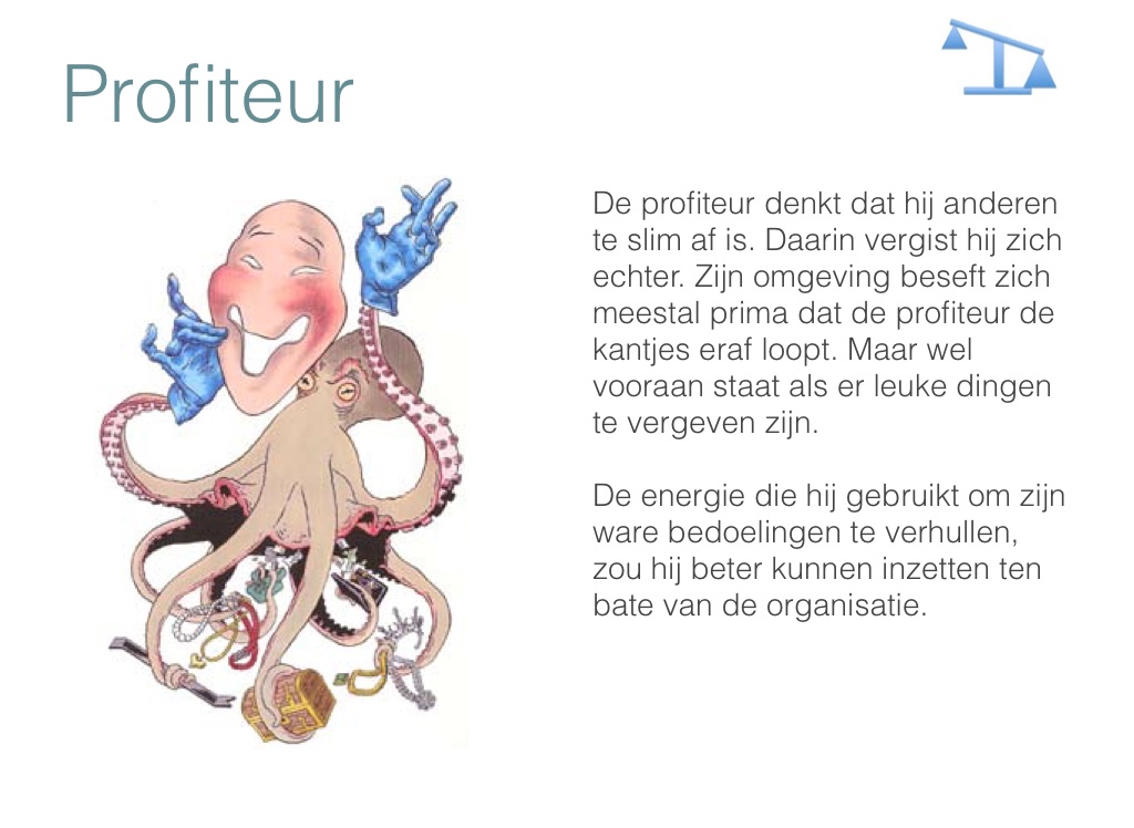 De profiteur denkt dat hij anderen te slim af is. Daarin vergist hij zich echter. Zijn omgeving beseft zich meestal prima dat de profiteur de kantjes eraf loopt. Maar wel vooraan staat als er leuke dingen te vergeven zijn.