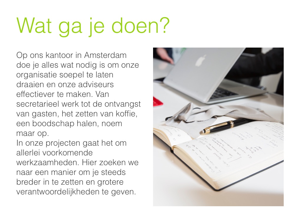 Op ons kantoor in Amsterdam doe je alles wat nodig is om onze organisatie soepel te laten draaien en onze adviseurs effectiever te maken. Van secretarieel werk tot de ontvangst van gasten, het zetten van koffie, een boodschap halen, noem maar op.