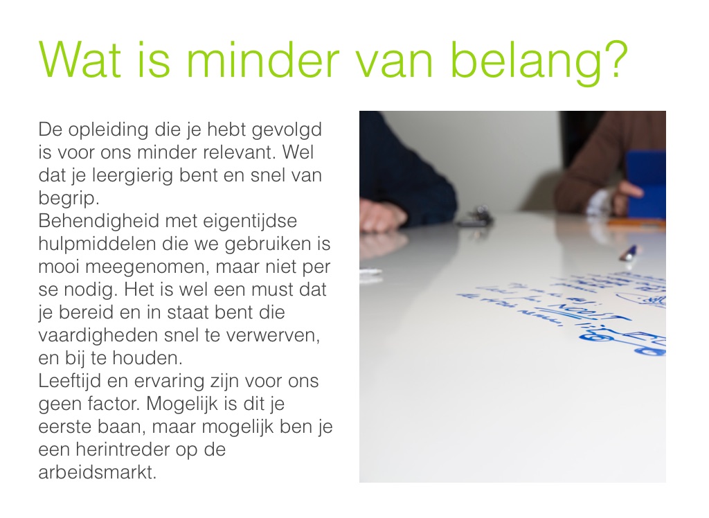 Behendigheid met eigentijdse hulpmiddelen die we gebruiken is mooi meegenomen, maar niet per se nodig. Het is wel een must dat je bereid en in staat bent die vaardigheden snel te verwerven, en bij te houden.