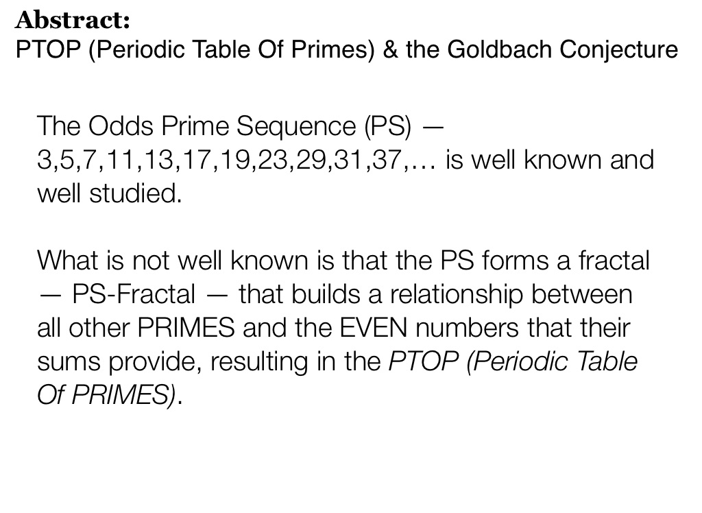 What is not well known is that the PS forms a fractal — PS-Fractal — that builds a relationship between all other PRIMES and the EVEN numbers that their sums provide, resulting in the PTOP (Periodic Table Of PRIMES).