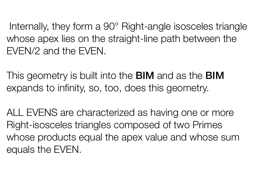 ALL EVENS are characterized as having one or more Right-isosceles triangles composed of two Primes whose products equal the apex value and whose sum equals the EVEN.