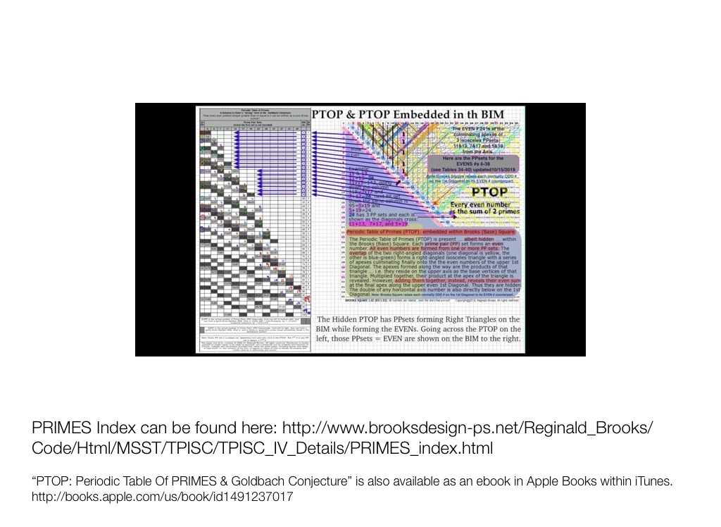 While “hidden” on the BIM (BBS-ISL Matrix), the PRIMES form PPsets — pairs — whose members lie in equal, symmetrical steps on either side of the EVENS number that has been divided by 2. This geometric, embedded pattern on the BIM can be presented as the PTOP: Periodic Table Of PRIMES. Here, these PPsets form the EVENS. The PPsets become “Trails” of PPsets, that increasingly overlap such that more than one PPset is present to compose a given EVEN. In doing so, they satisfy and prove the Goldbach Conjecture!