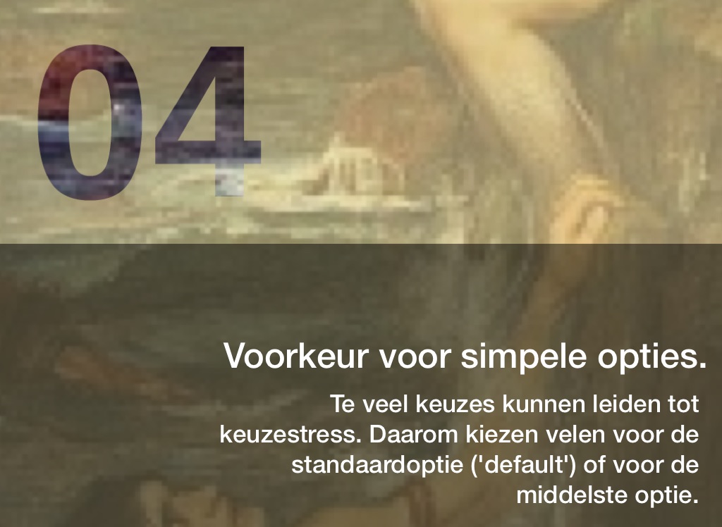 Te veel keuzes kunnen leiden tot keuzestress. Daarom kiezen velen voor de standaardoptie ('default') of voor de middelste optie.