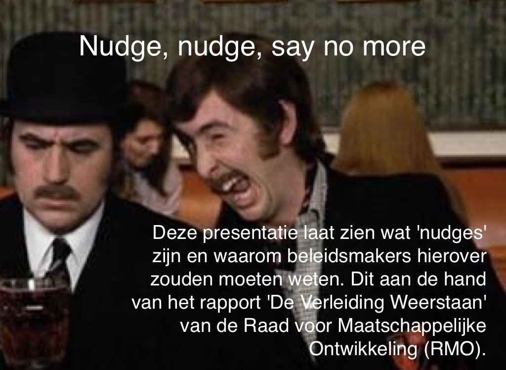 Deze presentatie laat zien wat 'nudges' zijn en waarom beleidsmakers hierover zouden moeten weten. Dit aan de hand van het rapport 'De Verleiding Weerstaan' van de Raad voor Maatschappelijke Ontwikkeling (RMO).