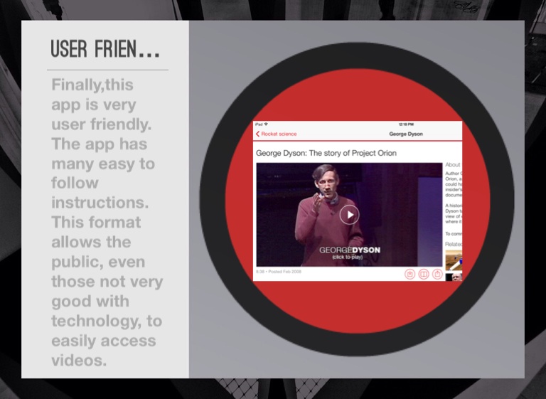 Finally,this app is very user friendly. The app has many easy to follow instructions. This format allows the public, even those not very good with technology, to easily access videos.