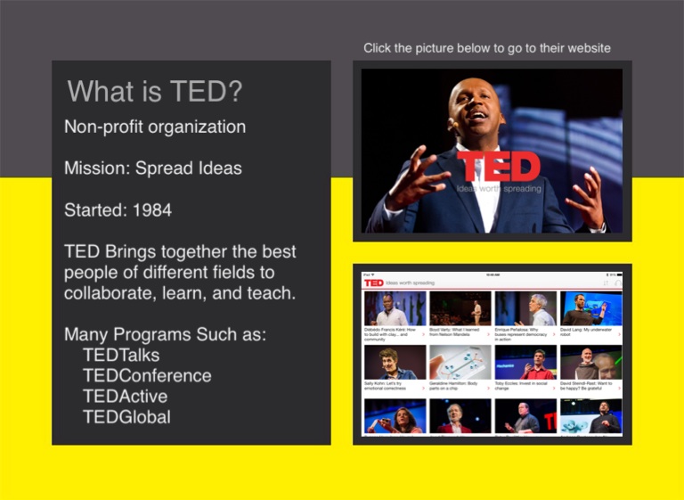 Non-profit organization Mission: Spread Ideas Started: 1984 TED Brings together the best people of different fields to collaborate, learn, and teach. Many Programs Such as: TEDTalks TEDConference TEDActive TEDGlobal