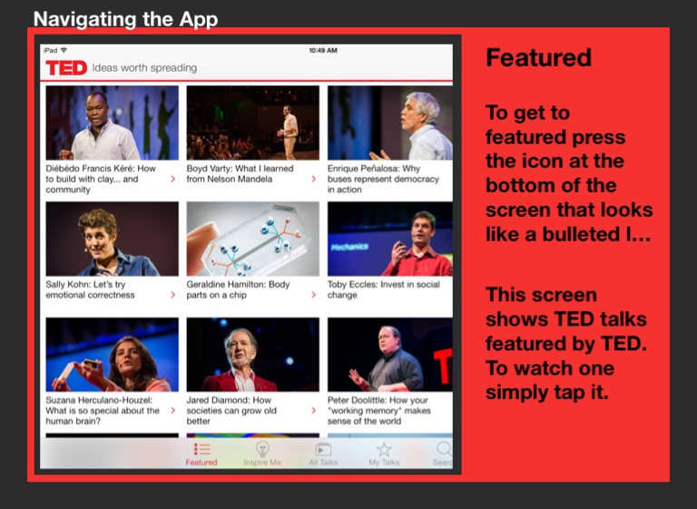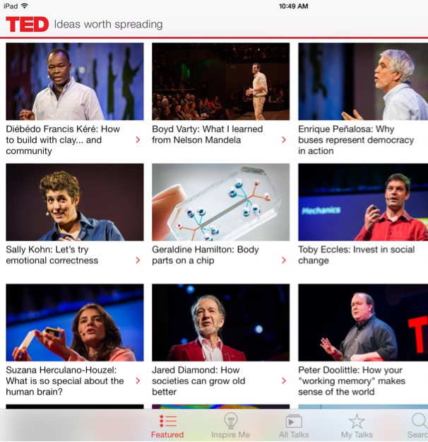 This screen shows TED talks featured by TED. To watch one simply tap it.