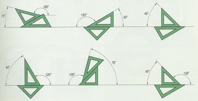 Podemos construir ángulos sumando los ángulos de la escuadra y el cartabón.Aquí tenemos algunos ejemplos:
