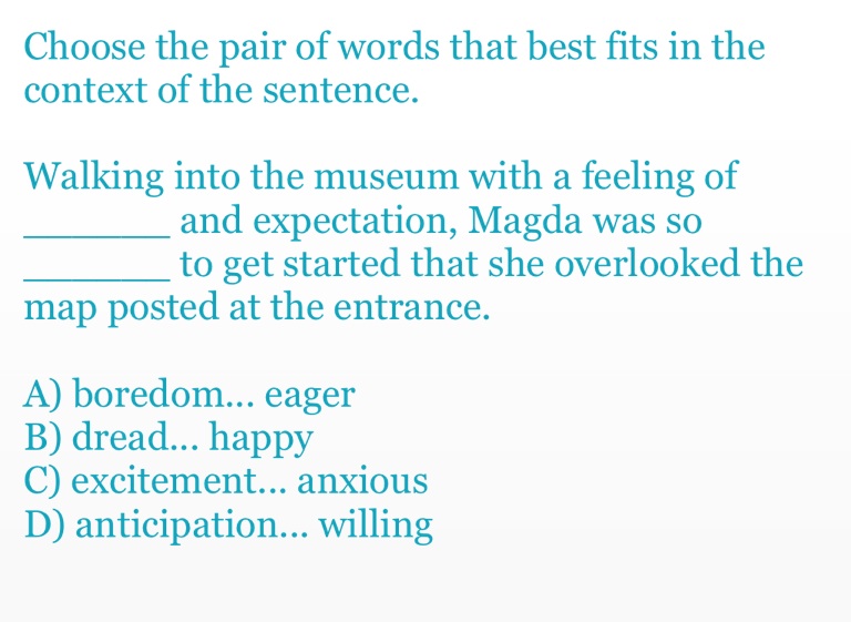 Walking into the museum with a feeling of ______ and expectation, Magda was so ______ to get started that she overlooked the map posted at the entrance.