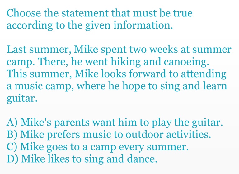 Last summer, Mike spent two weeks at summer camp. There, he went hiking and canoeing. This summer, Mike looks forward to attending a music camp, where he hope to sing and learn guitar.