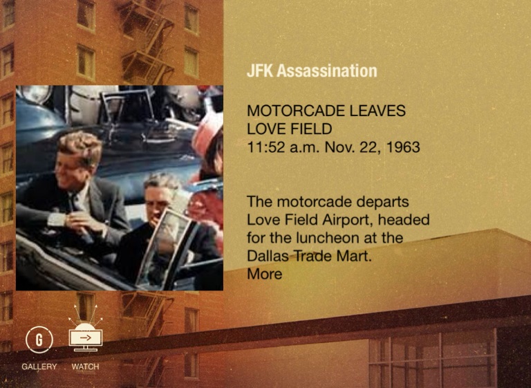 MOTORCADE LEAVES LOVE FIELD 11:52 a.m. Nov. 22, 1963 The motorcade departs Love Field Airport, headed for the luncheon at the Dallas Trade Mart. More