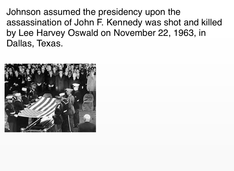 Johnson assumed the presidency upon the assassination of John F. Kennedy was shot and killed by Lee Harvey Oswald on November 22, 1963, in Dallas, Texas.