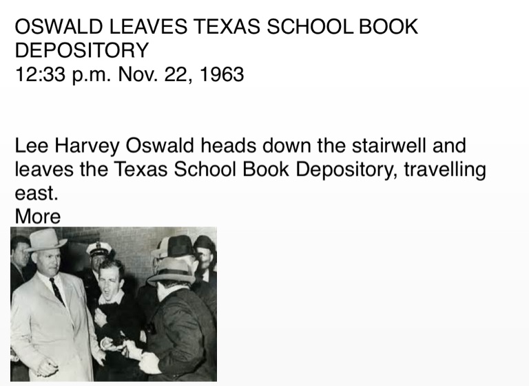 Lee Harvey Oswald heads down the stairwell and leaves the Texas School Book Depository, travelling east.