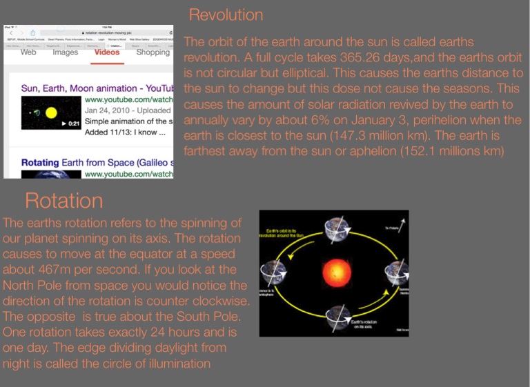 The orbit of the earth around the sun is called earths revolution. A full cycle takes 365.26 days,and the earths orbit is not circular but elliptical. This causes the earths distance to the sun to change but this dose not cause the seasons. This causes the amount of solar radiation revived by the earth to annually vary by about 6% on January 3, perihelion when the earth is closest to the sun (147.3 million km). The earth is farthest away from the sun or aphelion (152.1 millions km)
