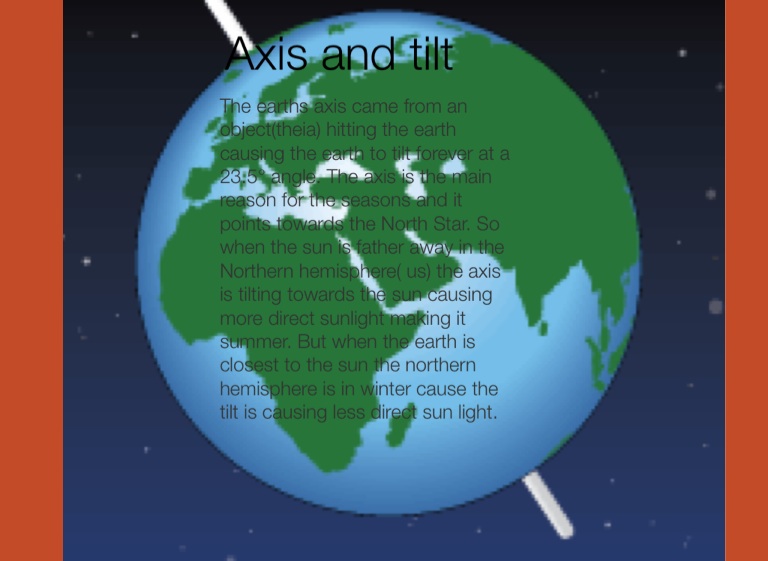 The earths axis came from an object(theia) hitting the earth causing the earth to tilt forever at a 23.5° angle. The axis is the main reason for the seasons and it points towards the North Star. So when the sun is father away in the Northern hemisphere( us) the axis is tilting towards the sun causing more direct sunlight making it summer. But when the earth is closest to the sun the northern hemisphere is in winter cause the tilt is causing less direct sun light.