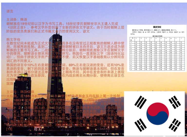 韩国的语言中10%左右是朝鲜语固有词,69%左右是汉语的变音,还有10%是英语的变音,剩下的则是其他语言的变音。韩语与朝鲜语基本相同,但在发音和外来语以及部分语法及单词的用法上稍有不同,其中在发音和外来语上表现尤为突出。因为政治原因,朝鲜半岛在内战后南北长期分裂,使得南北语言也出现略微差异。
