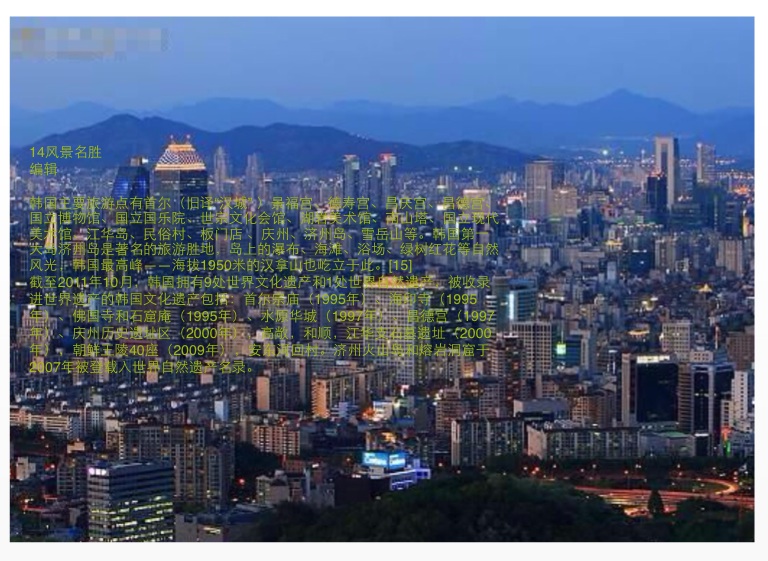 韩国主要旅游点有首尔(旧译“汉城” )景福宫、德寿宫、昌庆宫、昌德宫、国立博物馆、国立国乐院、世宗文化会馆、湖岩美术馆、南山塔、国立现代美术馆、江华岛、民俗村、板门店 、庆州、济州岛、雪岳山等。韩国第一大岛济州岛是著名的旅游胜地,岛上的瀑布、海滩、浴场、绿树红花等自然风光,韩国最高峰——海拔1950米的汉拿山也屹立于此。[15]