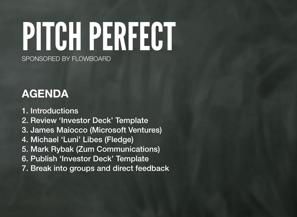 Please join us at WeWork on September 16, at 1pm, for a “Lunch and Learn” on creating the best investor pitch. We will look at both the content and flow and the actual design with experts who will give advice and feedback. We have two (or more) investors, James Maiocco (Microsoft Ventures) and Michael ‘Luni’ Libes (Fledge), and an expert presentation designer, Mark Rybak (Zum Communications). This will be a working session, so bring your Flowboard presentations or PowerPoint or Keynote and our experts will help fine tune your pitch. Lunch included.