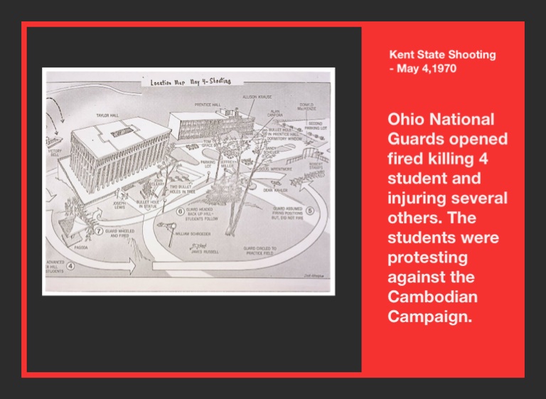 Ohio National Guards opened fired killing 4 student and injuring several others. The students were protesting against the Cambodian Campaign.