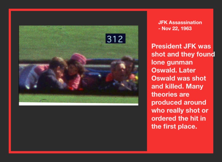 President JFK was shot and they found lone gunman Oswald. Later Oswald was shot and killed. Many theories are produced around who really shot or ordered the hit in the first place.