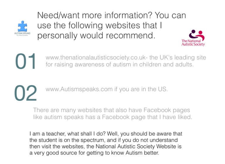 I am a teacher, what shall I do? Well, you should be aware that the student is on the spectrum, and if you do not understand then visit the websites, the National Autistic Society Website is a very good source for getting to know Autism better.