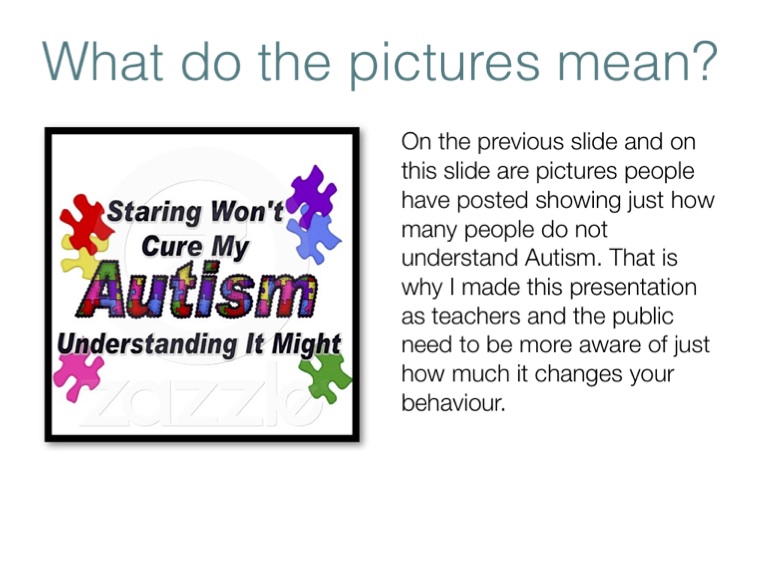 On the previous slide and on this slide are pictures people have posted showing just how many people do not understand Autism. That is why I made this presentation as teachers and the public need to be more aware of just how much it changes your behaviour.
