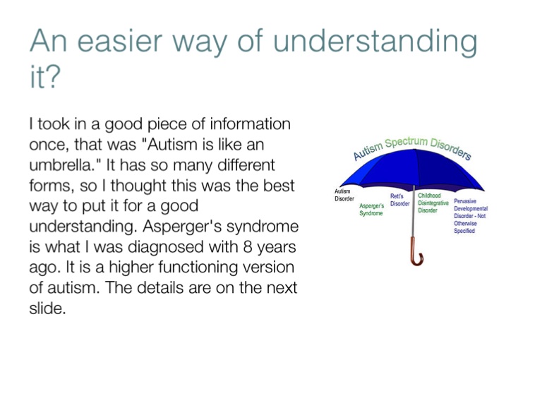 I took in a good piece of information once, that was "Autism is like an umbrella." It has so many different forms, so I thought this was the best way to put it for a good understanding. Asperger's syndrome is what I was diagnosed with 8 years ago. It is a higher functioning version of autism. The details are on the next slide.