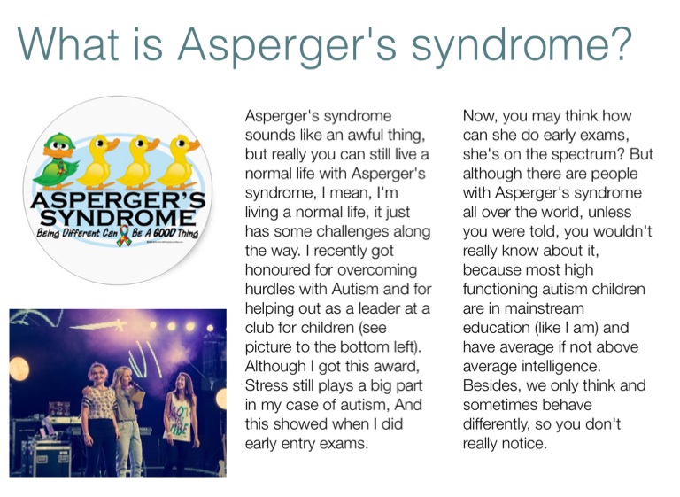 Asperger's syndrome sounds like an awful thing, but really you can still live a normal life with Asperger's syndrome, I mean, I'm living a normal life, it just has some challenges along the way. I recently got honoured for overcoming hurdles with Autism and for helping out as a leader at a club for children (see picture to the bottom left). Although I got this award, Stress still plays a big part in my case of autism, And this showed when I did early entry exams.