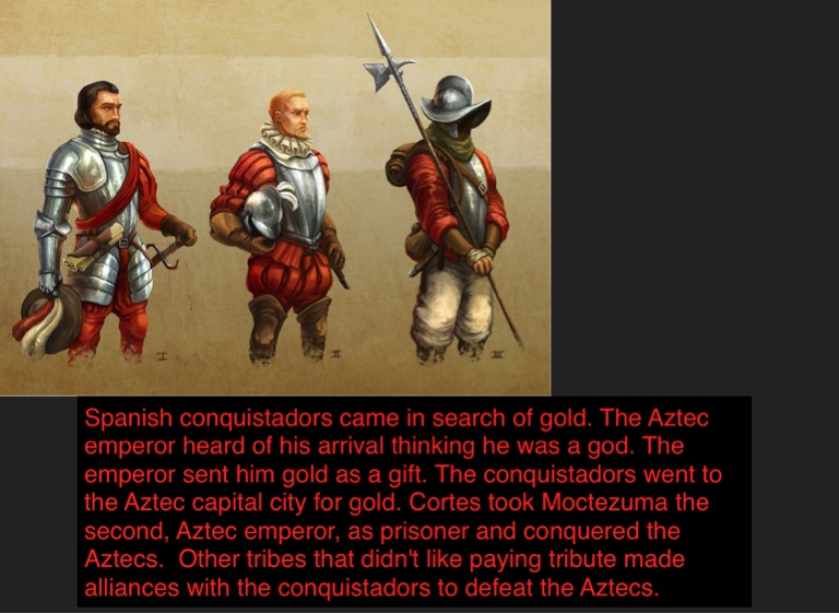 Spanish conquistadors came in search of gold. The Aztec emperor heard of his arrival thinking he was a god. The emperor sent him gold as a gift. The conquistadors went to the Aztec capital city for gold. Cortes took Moctezuma the second, Aztec emperor, as prisoner and conquered the Aztecs. Other tribes that didn't like paying tribute made alliances with the conquistadors to defeat the Aztecs.