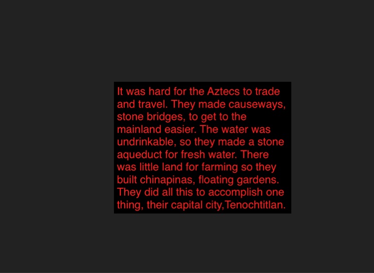 It was hard for the Aztecs to trade and travel. They made causeways, stone bridges, to get to the mainland easier. The water was undrinkable, so they made a stone aqueduct for fresh water. There was little land for farming so they built chinapinas, floating gardens. They did all this to accomplish one thing, their capital city,Tenochtitlan.