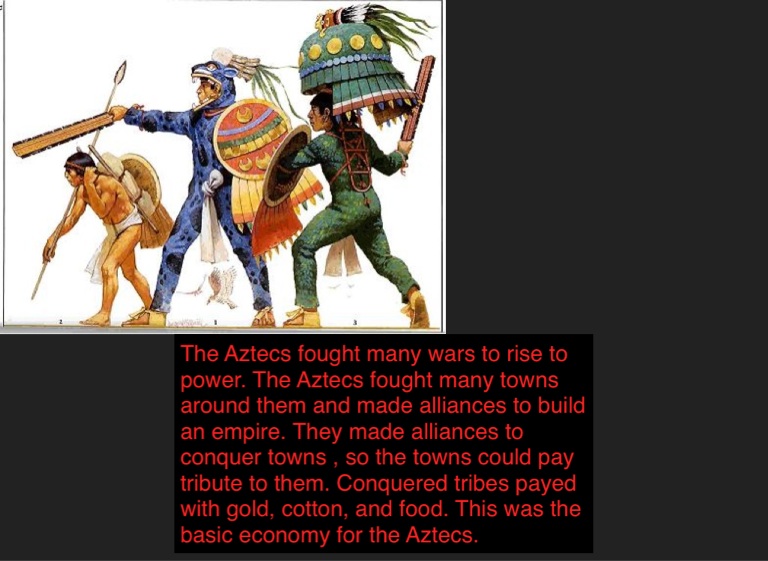 The Aztecs fought many wars to rise to power. The Aztecs fought many towns around them and made alliances to build an empire. They made alliances to conquer towns , so the towns could pay tribute to them. Conquered tribes payed with gold, cotton, and food. This was the basic economy for the Aztecs.