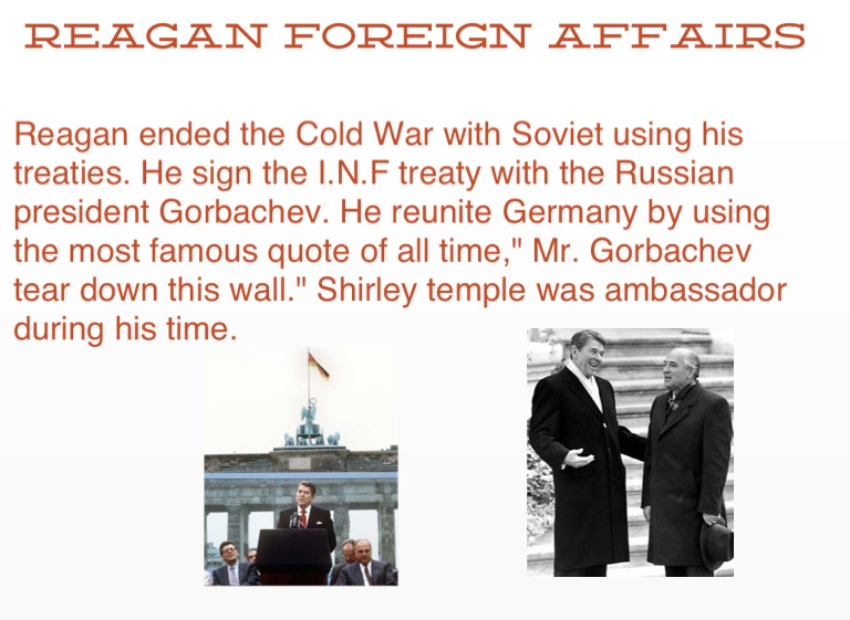 Reagan ended the Cold War with Soviet using his treaties. He sign the I.N.F treaty with the Russian president Gorbachev. He reunite Germany by using the most famous quote of all time," Mr. Gorbachev tear down this wall." Shirley temple was ambassador during his time.