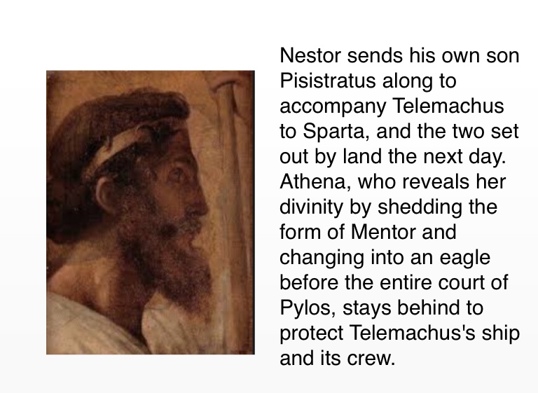 Nestor sends his own son Pisistratus along to accompany Telemachus to Sparta, and the two set out by land the next day. Athena, who reveals her divinity by shedding the form of Mentor and changing into an eagle before the entire court of Pylos, stays behind to protect Telemachus's ship and its crew.