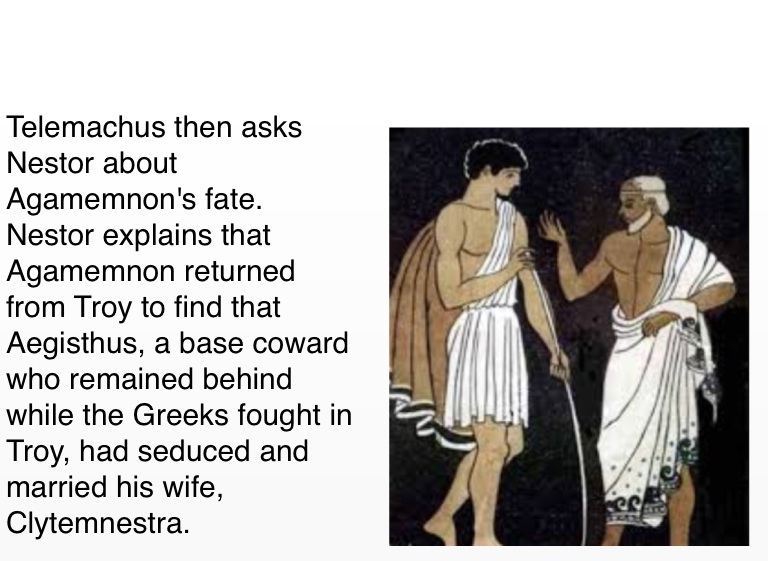 Telemachus then asks Nestor about Agamemnon's fate. Nestor explains that Agamemnon returned from Troy to find that Aegisthus, a base coward who remained behind while the Greeks fought in Troy, had seduced and married his wife, Clytemnestra.