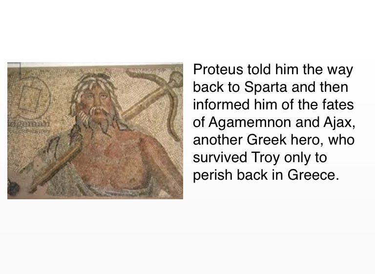 Proteus told him the way back to Sparta and then informed him of the fates of Agamemnon and Ajax, another Greek hero, who survived Troy only to perish back in Greece.