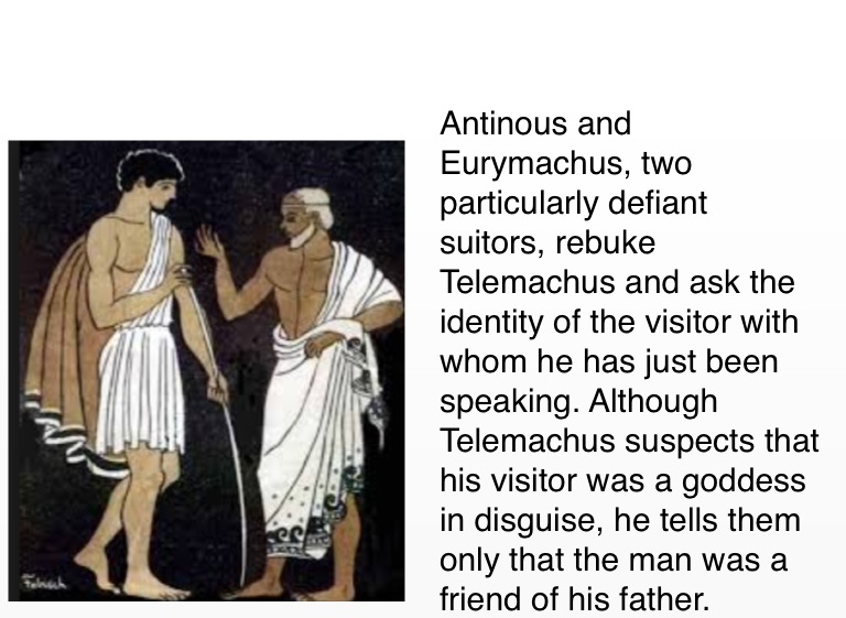 Antinous and Eurymachus, two particularly defiant suitors, rebuke Telemachus and ask the identity of the visitor with whom he has just been speaking. Although Telemachus suspects that his visitor was a goddess in disguise, he tells them only that the man was a friend of his father.