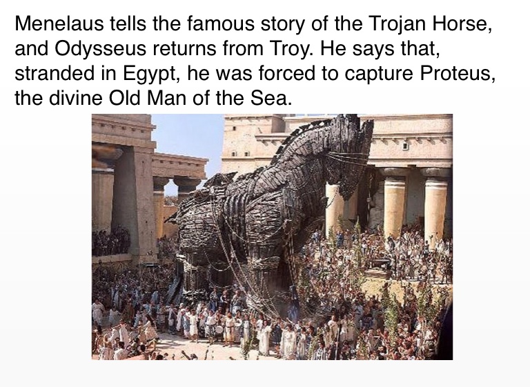 Menelaus tells the famous story of the Trojan Horse, and Odysseus returns from Troy. He says that, stranded in Egypt, he was forced to capture Proteus, the divine Old Man of the Sea.