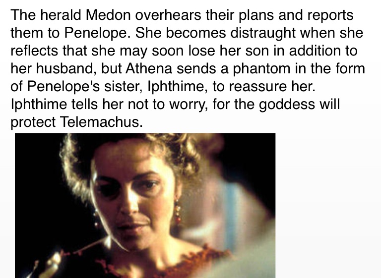 The herald Medon overhears their plans and reports them to Penelope. She becomes distraught when she reflects that she may soon lose her son in addition to her husband, but Athena sends a phantom in the form of Penelope's sister, Iphthime, to reassure her. Iphthime tells her not to worry, for the goddess will protect Telemachus.