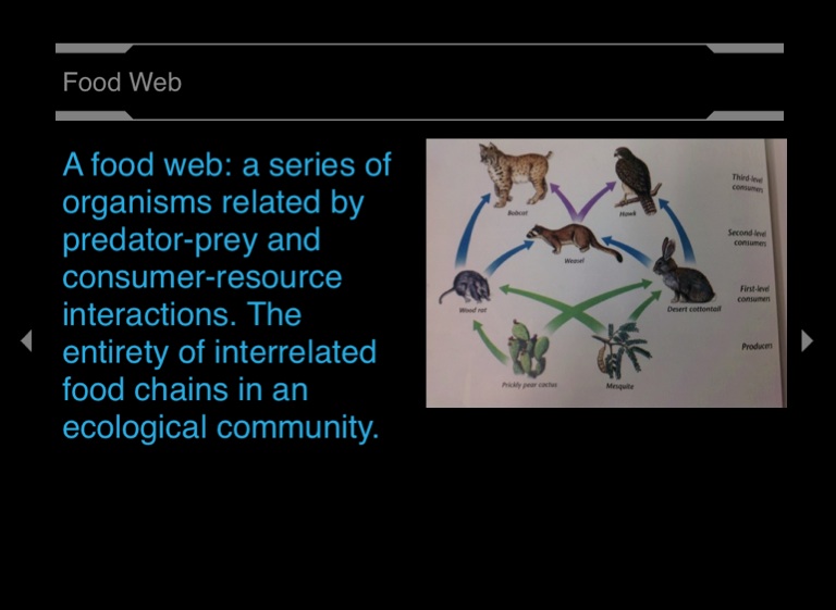 A food web: a series of organisms related by predator-prey and consumer-resource interactions. The entirety of interrelated food chains in an ecological community.