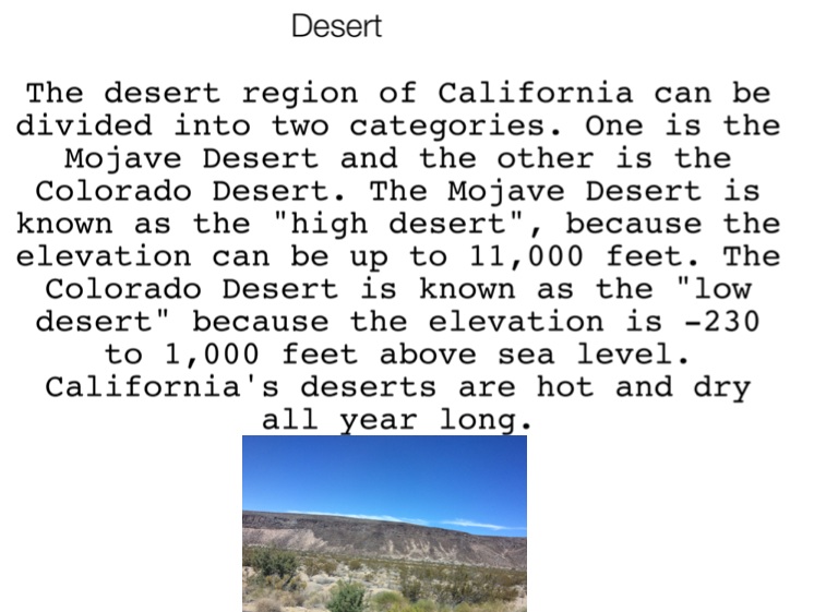 The desert region of California can be divided into two categories. One is the Mojave Desert and the other is the Colorado Desert. The Mojave Desert is known as the "high desert", because the elevation can be up to 11,000 feet. The Colorado Desert is known as the "low desert" because the elevation is -230 to 1,000 feet above sea level. California's deserts are hot and dry all year long.