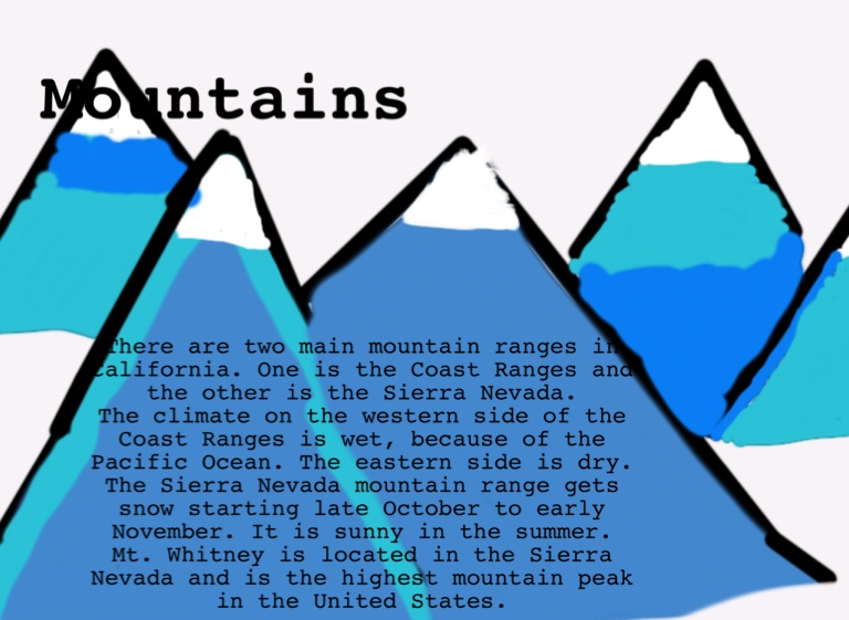 There are two main mountain ranges in California. One is the Coast Ranges and the other is the Sierra Nevada.