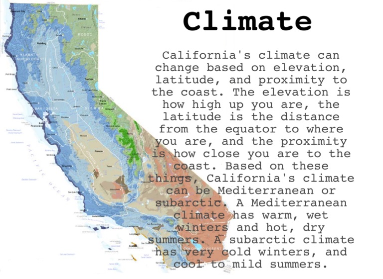 California's climate can change based on elevation, latitude, and proximity to the coast. The elevation is how high up you are, the latitude is the distance from the equator to where you are, and the proximity is how close you are to the coast. Based on these things, California's climate can be Mediterranean or subarctic. A Mediterranean climate has warm, wet winters and hot, dry summers. A subarctic climate has very cold winters, and cool to mild summers.